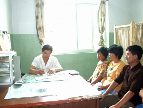 图1为:韩春利同志在听取患者自述病情,作详细记录与诊断。