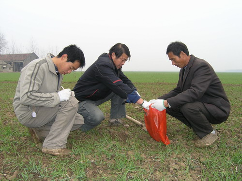 2005年午季,地处淮河之滨的潘村湖农场部分田块发生罕见的小麦吸浆虫灾害,当年有数百亩小麦减产幅度很大。2006年,该场在省市植保部门的指导下,制定了周密的防治方案,有效地遏制了小麦吸浆虫的爆发态势,全场3.2万亩小麦平均单产历史性地达到940斤。为彻底根除小麦吸浆虫,从11月底开始,该场组织农技人员在全场80多块条田挖取土样近500份,按有关技术规程进行淘土调查以确定虫情,制定相应的防治措施。图为12月5日上午,农场技术人员正在一分场大田采取土样的情景。(杨登宏摄)