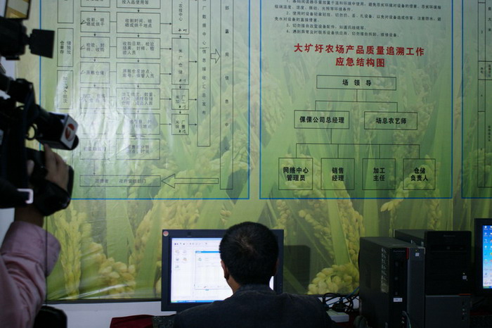 大圹圩农场2008年成为全国首批、安徽省首家实施大米生产质量追溯系统建设项目单位,历经3年建设,目前生产可记录,信息可查询,流程可跟踪,责任可追究的追溯系统已全面形成,倮倮大米实现了“从农田到餐桌”全程质量安全体系,3年累计追溯规模达43262亩。眼下正值该场水稻收获、新谷收购、大米加工季节,安徽电视台摄制组深入各农管区实地拍摄了倮倮米业原粮生产、收获储藏、大米加工的质量追溯过程,并向相关人员进行了现场采访。